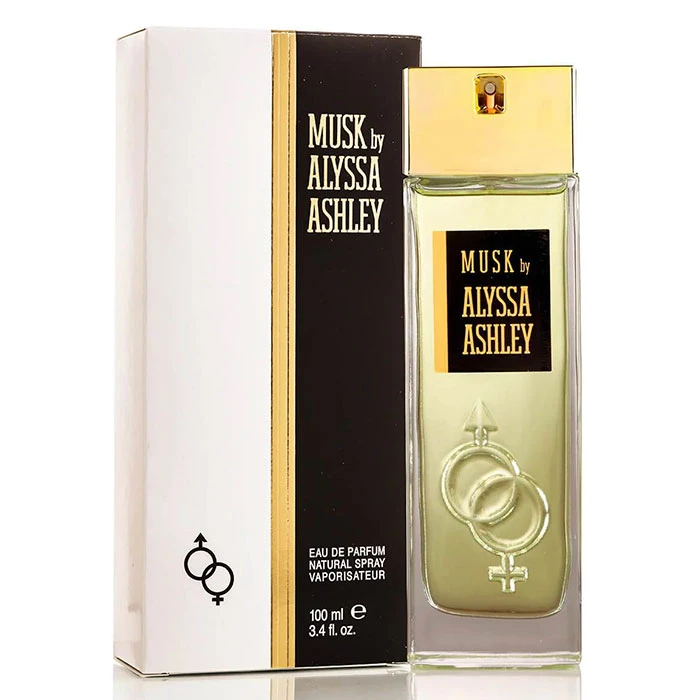El frasco de Alyssa Ashley Musk Eau de Parfum es transparente de rectas y puras donde se remarcan en el cristal los sÃmbolos masculino y femenino entrecruzados entre sÃ. En la parte frontal, una etiqueta negra que contrasta con el color del jugo. Coronado con un tapón dorado brillante que inspira belleza y elegancia.