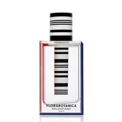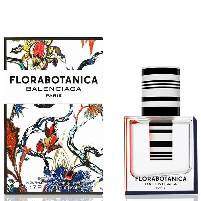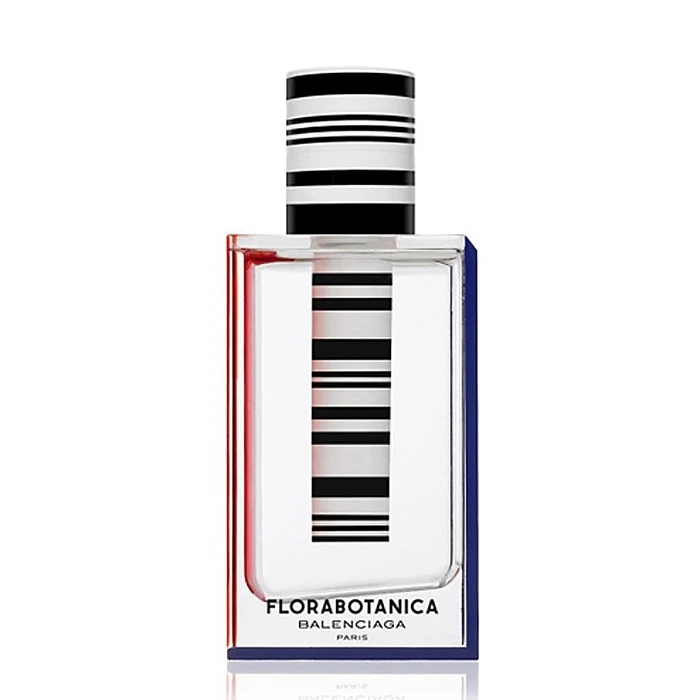 La fragancia Florabotanica tiene la apariencia de un tubo de ensaño, simula una paradoja sensorial entre la experimentación rigurosa y la poesía del espíritu de las plantas. Un frasco minimalista, de corte geométrico, con bordes rojos y azules y unas llamativas barras blancas y negras en el tapón que evocan la marca de Cristobal Balenciaga.