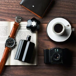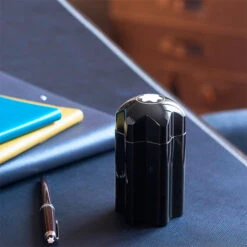 El frasco que esconde el aroma es viril y auténtico. Con una forma armoniosa, elegante y facetada, es de baquelita y esta tintado en un negro intenso y fuerte. Su forma nos recuerda a los tinteros que esta marca vende, un clásico de la marca.Â