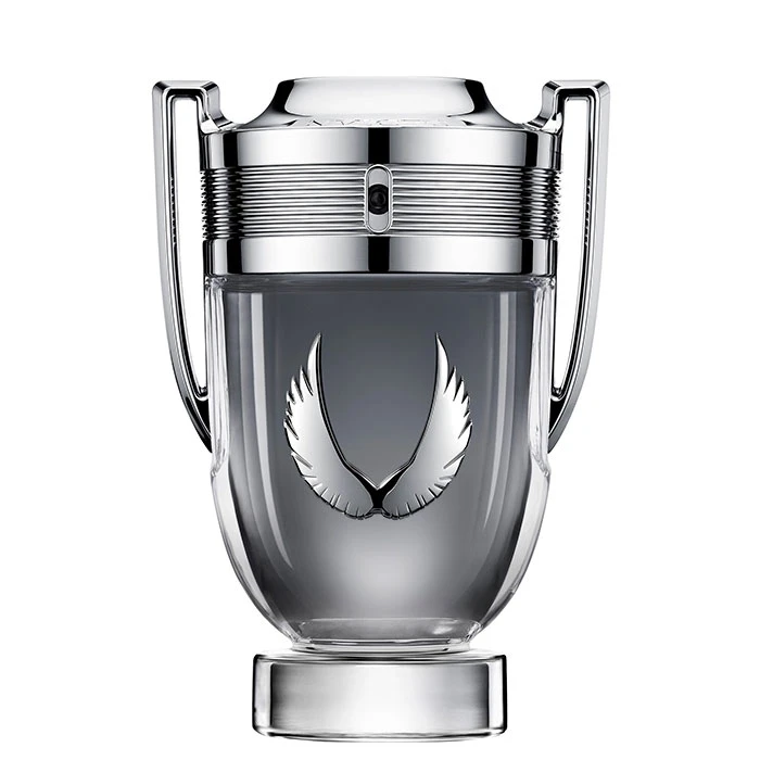 El frasco de Invictus Platinum Eau de Parfum plasma las alas de Invictus, en un brillante acabado en relieve de platino en forma de trofeo. Su cristal revela gradualmente matices de grises más intensos y está coronado en cromo. ¡Brilla, eleva el juego aún más alto para alcanzar tu trofeo!