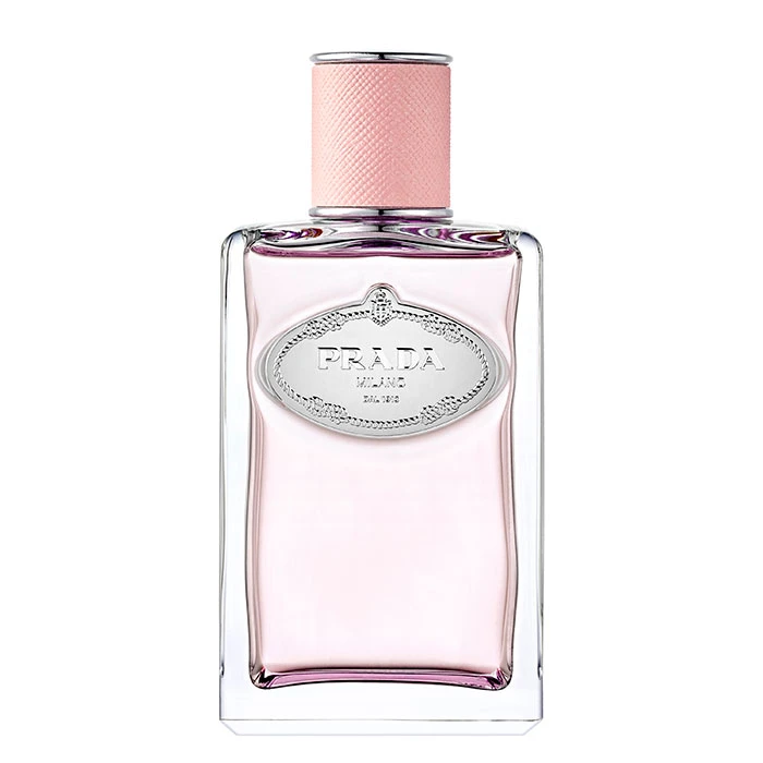 El frasco calca la forma de los perfumes de su línea, vidrio transparente que deja entrever el color rosáceo que caracteriza este perfume, con un toque vintage que le da el logo de Prada sobre un fondo redondo en planteado, justo en el centro del fasco.