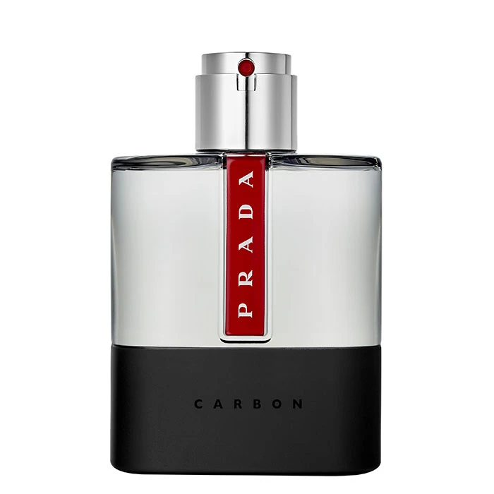 El frasco de Luna Rossa Carbon mantiene el aspecto visual de la lÃnea Luna Rossa de Prada, innovando en los distintos materiales utilizados. Un frasco rectangular de vidrio negro transparente, se decora en la parte inferior con un color carbón de acabado mate y textura aterciopelada, dando impresión de pureza y refinamiento. Como toque final, en el frente, el logo de Prada aparece en vertical y subrayado en color rojo, sumando energÃa y un punto distintivo.